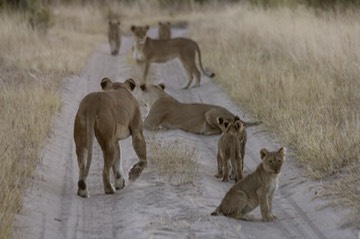 8 lions walking down the road