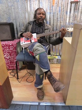 His music is on the video preview on the home page. It starts with the elephants. Very good blues music on a castrol guitar