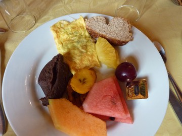 Yummy breakfast and very colorful, too. The brown stuff is beans, not pudding
