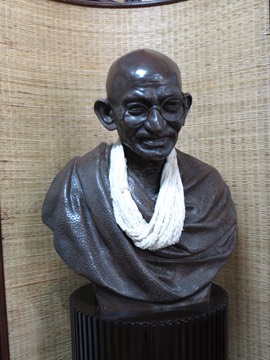 Mohandas Karamchand Gandhi, 1869-1948, was known to his followers as Mahatma, “the great-souled one.” He was recognized throughout the world for his non-violent philosophy of passive resistance. Gandhi was a leading figure in the civil rights movement in S. Africa and in India’s struggle for independence from Great Britain. He was admired and respected by millions around the world.