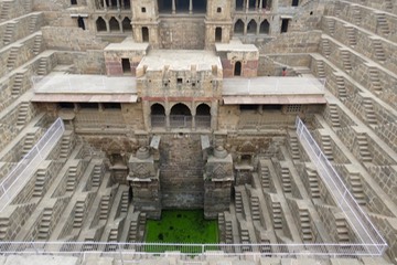 Built over a 1000 years ago, this step well in Abhaneri, Rajasthan, has 3500 steps that descend about 64 feet to the water below. Step wells like these were built to provide year round water in the arid regions.