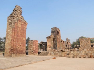 Remnants of the mosque, built in 1198. On the right, you can see the iron pillar, built in the 4th century. It is about 98% iron and has stood rustless for the last 1600 years.