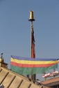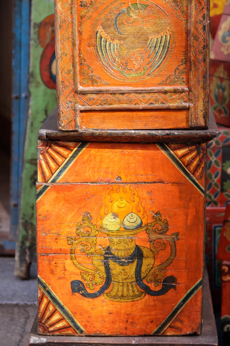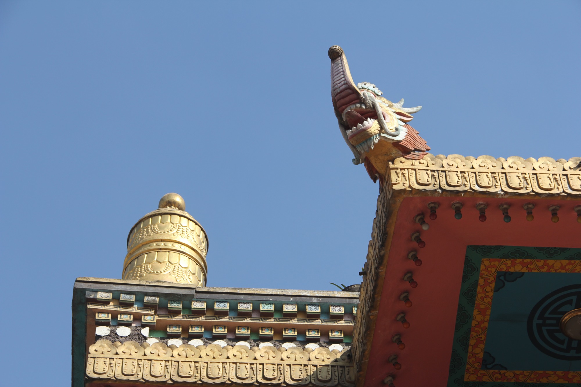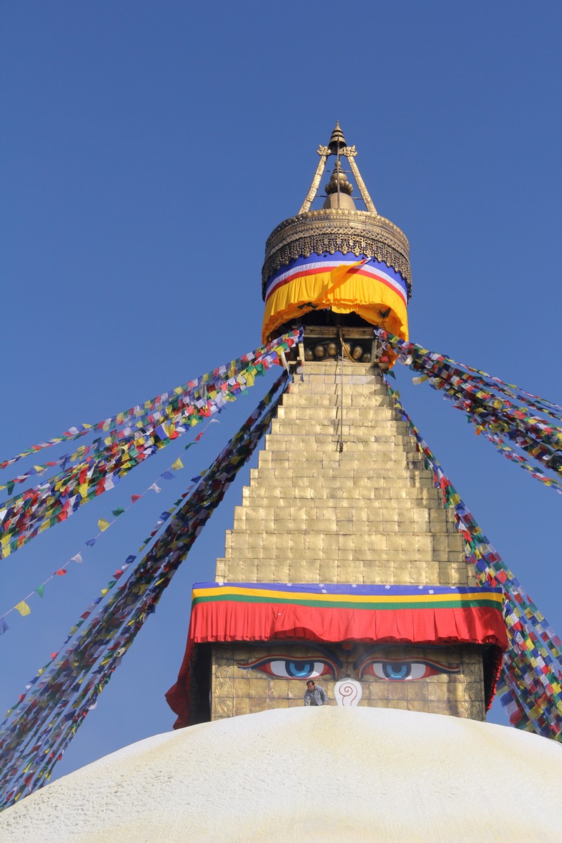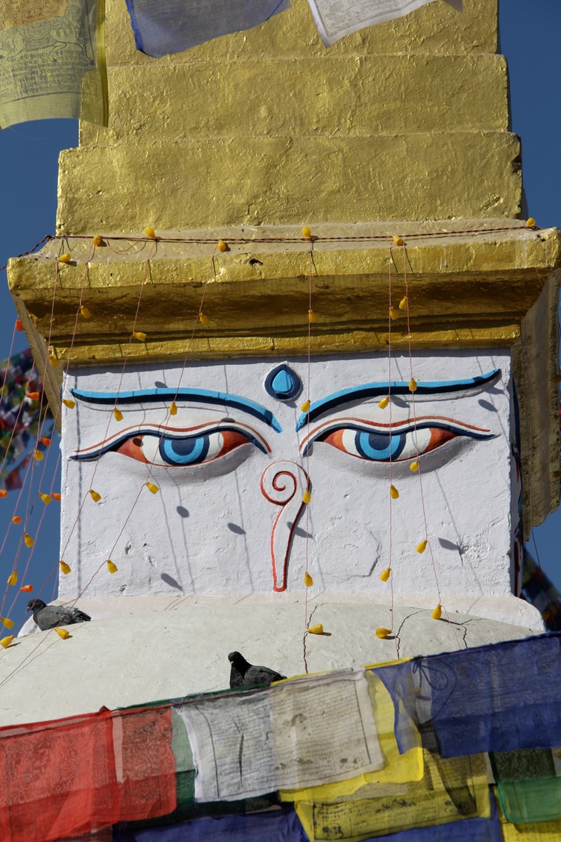 The stupa is topped by a square tower bearing the seeing eyes of Buddha on each of the four sides. The nose is in the shape of the Sanskrit numeral one, symbolizing the unity of all things. The small dot between the eyes represents the third eye, a symbol of spiritual awakening. Atop the square tower is a pyramid of thirteen steps - the ladder to enlightenment.